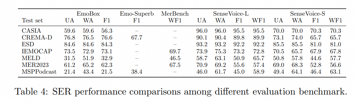 由于目前缺乏被广泛使用的情感识别测试指标和方法,我们在多个测试集的多种指标进行测试,并与近年来Benchmark上的多个结果进行了全面的对比。所选取的测试集同时包含中文/英文两种语言以及表演、影视剧、自然对话等多种风格的数据,在不进行目标数据微调的前提下,SenseVoice能够在测试数据上达到和超过目前最佳情感识别模型的效果。