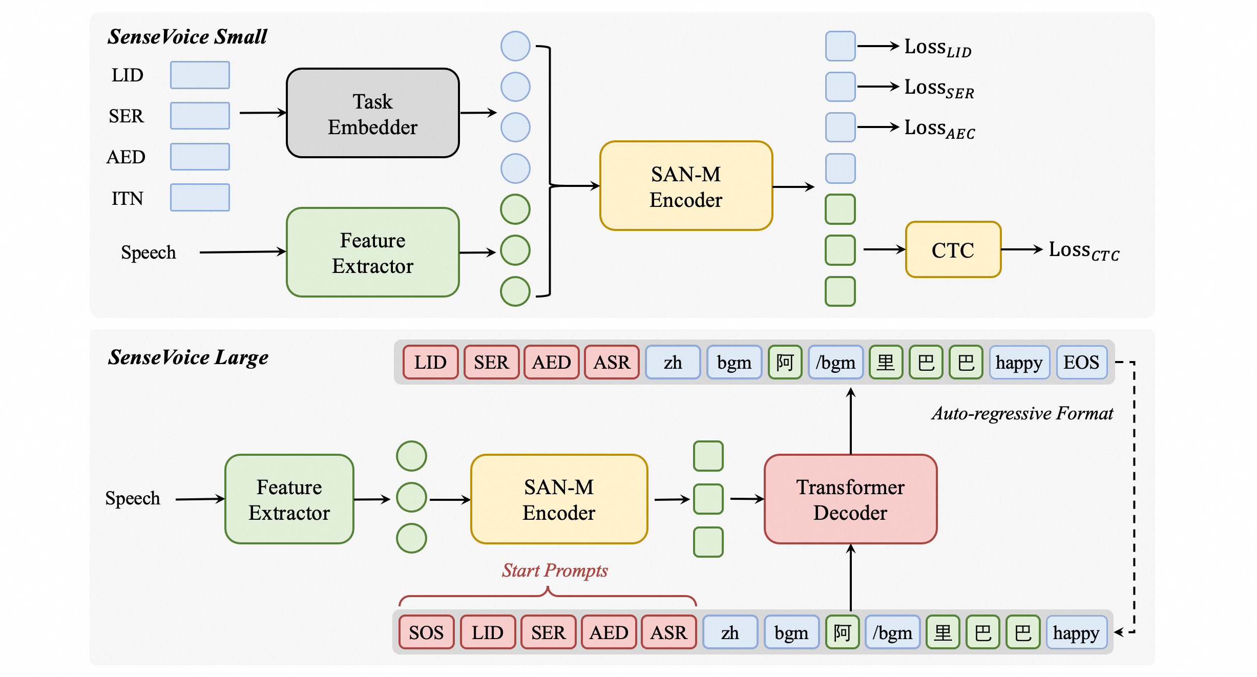 SenseVoice-Small是基于非自回归端到端框架模型,为了指定任务,我们在语音特征前添加四个嵌入作为输入传递给编码器: