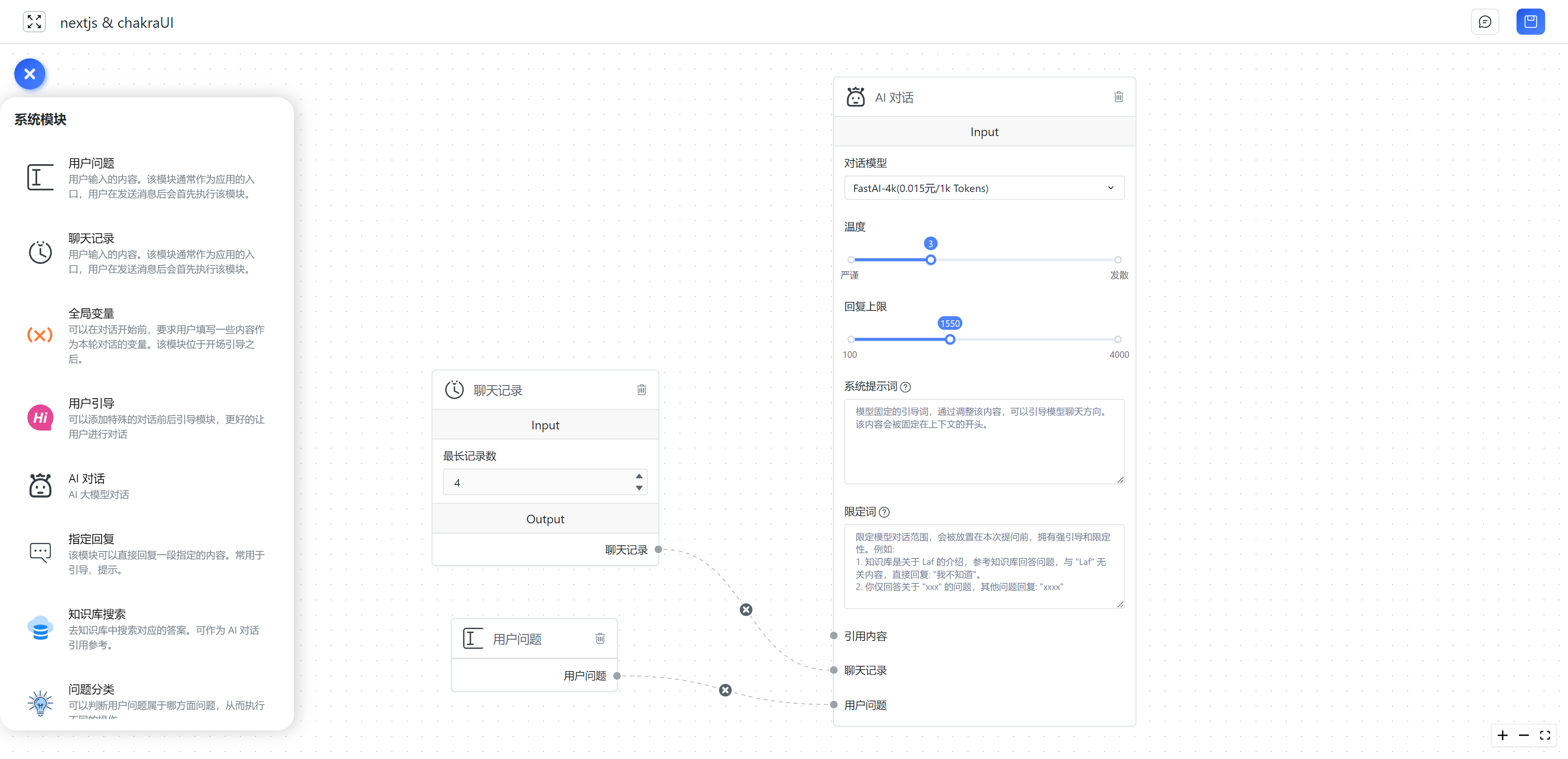 在程序中,模块可以理解为一个个 function 或者接口。对于非技术背景同学,可以理解为它就是一个步骤。将多个模块一个个拼接起来,即可一步步的去实现最终的 AI 输出。